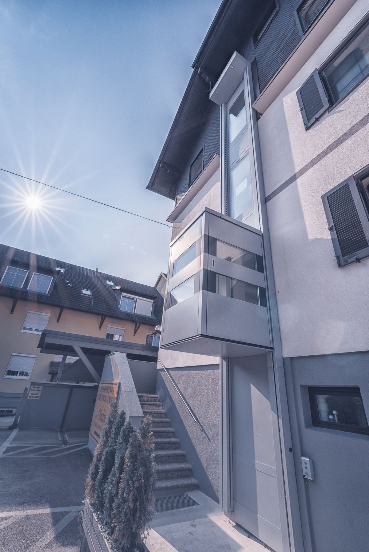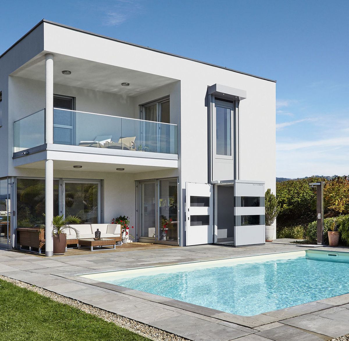 Výtahová kabina je v elegantním designu, a tak se hodí jako vnitřní nebo venkovní výtah. Prosklené části zajišťují dostatečný přísun denního světla a panoramatický výhled kolem dokola. Instalace domácího výtahu vám tak nenaruší vzhled domu, ale naopak ještě zvýší hodnotu vaší nemovitosti.